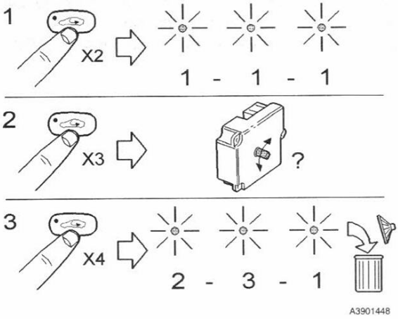 If the control module detects a fault, it stores a diagnostic trouble code (DTC) and the orange LEDs in the REC and the air conditioning (A/C) buttons flash for approximately 20 seconds. The control module can store up to 38 diagnostic trouble codes (DTCs). If the total diagnostic trouble codes (DTCs) exceeds 10 the five first diagnostic trouble codes (DTCs) will always be saved, while the last five become the latest diagnostic trouble code (DTCs) to be stored.