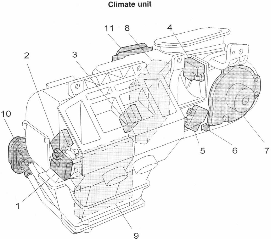 The on-board diagnostic (OBD) system can identify up to 10 faults, displayed as diagnostic trouble codes (DTCs). For fault-tracing, see MMB – DTC table for manual climate control unit, page 161.